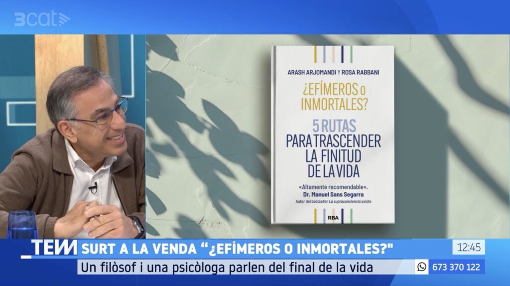 Arash Arjomandi, filòsof i professor d’ètica empresarial de l’Escola Universitària Salesiana de Sarrià (EUSS), ha presentat el seu nou llibre al programa ‘Tot es mou’ de TV3. El llibre ¿Efímeros o immportales? 5 rutas para trascender la finitud de la vida l’ha escrit amb la seva dona Rosa Rabbani, qui també ha estat present a la taula rodona del programa.