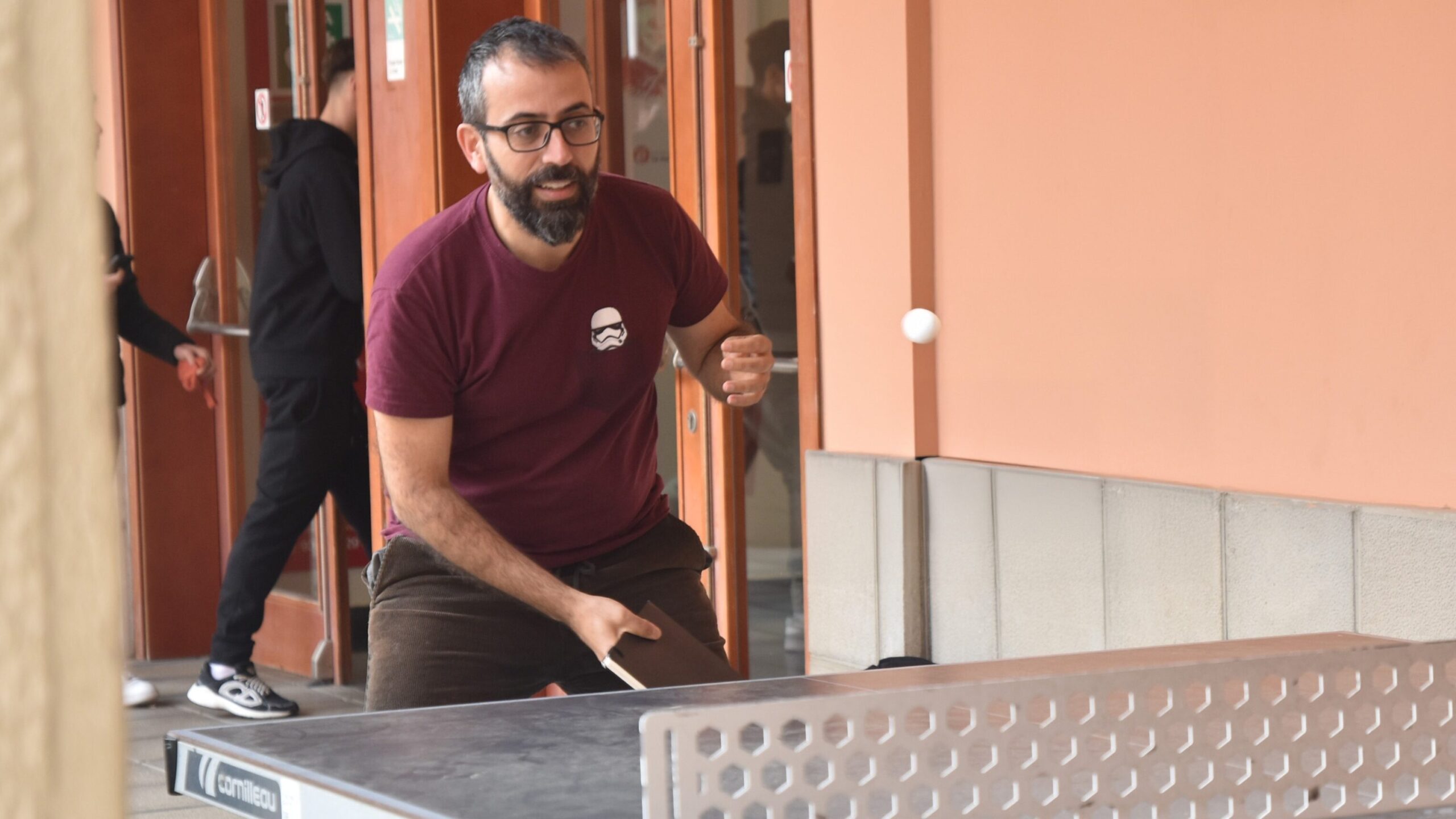 Aquest és l’altre amor que tinc, el ping-pong. El dia de l’entrevista, esperant al director, recordo veure la taula al pati, i em vaig dir… soc a casa! A part d’entrenar a un club, cada dimarts vespre competeixo a ping-pong, i és un món en el qual tinc molts amics i algunes victòries. Cada any aprofito l’assignatura d’antropologia per generar reptes a la taula, i jugo contra ells amb la meva agenda com a pala. Agafo una actitud xulesca que no va gaire amb mi, però suposo que trec una part fosca meva que necessito exposar a l’exterior. En realitat, m’ho passo molt bé amb ells, i m’alegra veure que hi dediquen temps, que socialitzen sense la mediació de tecnologies, i que practiquen un esport que és fantàstic a nivell físic i mental (tampoc soc objectiu aquí). I com dius, em permet conèixer-los d’una manera diferent, i riure una mica. Fora de l’aula els alumnes són més autèntics, hauríem de fer més classes fora de l’aula.